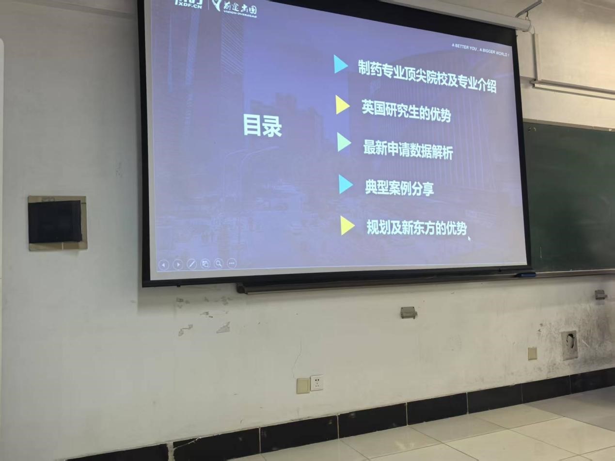 讲座伊始,新东方留学规划师刘玉贝老师凭借丰富的经验和专业知识,围绕留学申请的各个关键环节展开讲解。从如何根据自身条件选择合适的国外院校,到制药专业在国际上的发展趋势与就业前景,再到申请所需的各项材料准备,如成绩单、推荐信、个人陈述等,都进行了细致入微的分析。同时,还分享了面试技巧以及如何在申请中突出个人优势,让同学们对出国流程有了更清晰的认识。此外,刘老师还为同学们介绍了国际排名比较靠前的知名大学申请条件等。