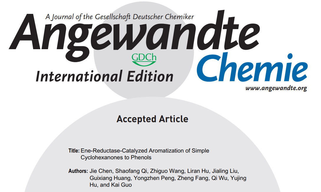 近日,best365官网郭凯教授团队在《Angewandte Chemie International Edition》发表题为“Ene-Reductase-Catalyzed Aromatization of Simple Cyclohexanones to Phenols”的研究性文章。郭凯教授和胡玉静副教授为共同通讯作者,硕士研究生陈杰为第一作者。