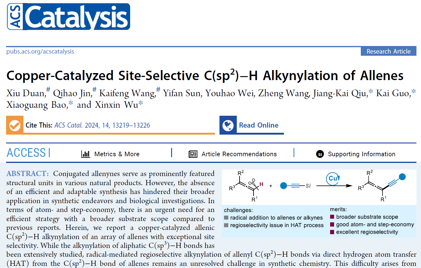 近日,best365官网的郭凯教授团队与苏州大学的吴新鑫等合作在国际知名期刊《ACS Catalysis》发表题为“Copper-Catalyzed Site-Selective C(sp2)-H Alkynylation of Allenes”的的研究论文。该论文解决了联烯或炔的自由基加成和HAT过程的区域选择性等问题,展示了更广泛的底物范围,优异的官能团耐受性,为多样性地合成共轭烯炔提供了新策略。邱江凯教授、鲍晓光教授为论文的共通讯作者,best365官方网站的博士研究生段秀为论文的第一作者,best365官方网站为第一通讯单位。