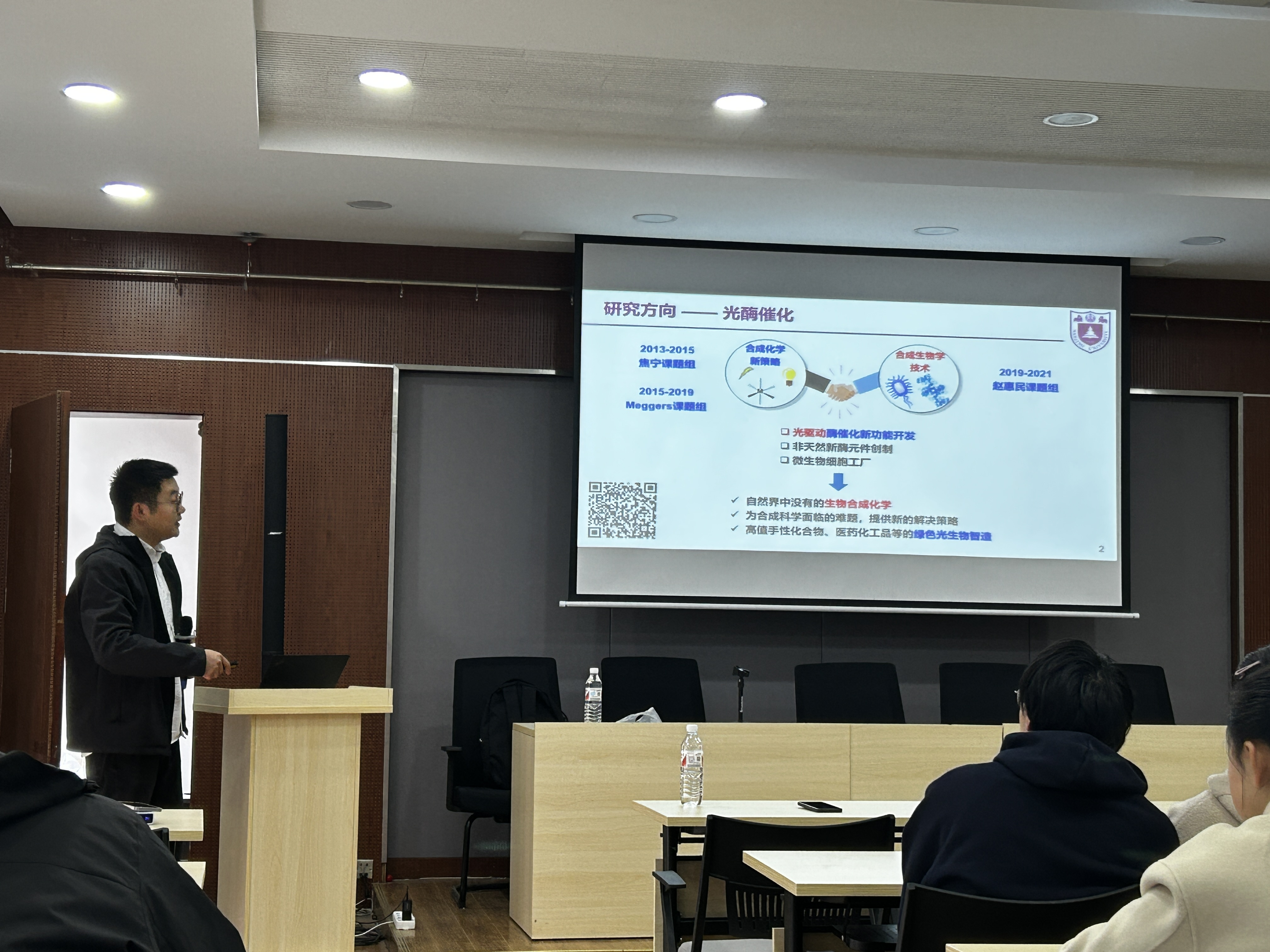 黄教授在报告中分享其课题组通过融合生物与化学的策略,创制新型酶元件以及开发非天然生物催化功能。首先,受自然界存在的脂肪酸光脱羧酶的启发,开发了可见光直接激发黄素蛋白体系,将烯烃还原酶“重塑”为光氧化自由基酶,实现了一例氧化还原中性的、立体发散式的酶促C(sp2)-C(sp3)偶联反应。其次,通过协同利用定向进化策略和光氧还原催化,创制的一类自由基转移酶,将单电子自由基交叉偶联的机制引入酶中,突破其天然的双电子极性转化机制,实现了一系列手性羰基化合物的高选择性不对称生物合成。最后,通过设计酶口袋内的电子给体受体络合物,重塑亚胺还原酶,赋予其调控单电子自由基碳碳成键新功能,实现了一系列手性胺化合物的不对称生物合成。报告结束时谈到如何走好科研之路的问题,黄教授说:“深读文献,找到出发点,有利于我们的科研之路”。
