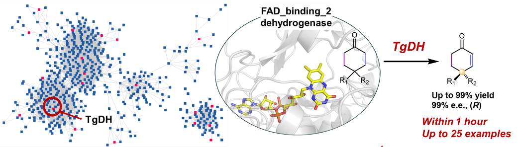 针对现有脱氢去饱和化酶活性差、选择性不高以及容易发生过度氧化反应等问题,本研究通过采用序列相似性网络挖掘大量潜在的脱氢酶序列,确定了一种黄素腺嘌呤二核苷酸(FAD)依赖型酶TgDH。该酶能够不对称地使环己酮类化合物去饱和化,从而构建远端γ-立体中心。与现有的生物催化剂相比,该酶的TOF提高了178倍,且过度氧化很少,实现了较高的对映体过量(> 99% e.e)和转化率(高达99%,一小时内)。此外,该酶还展示了用于克级制备的可操作性,这对工业应用至关重要。与之前报道的酶相比,TgDH在不需要酶纯化的情况下就能提供更强的催化性能,并且在更温和的条件下运行,在更短的反应时间内提供更高的效率。