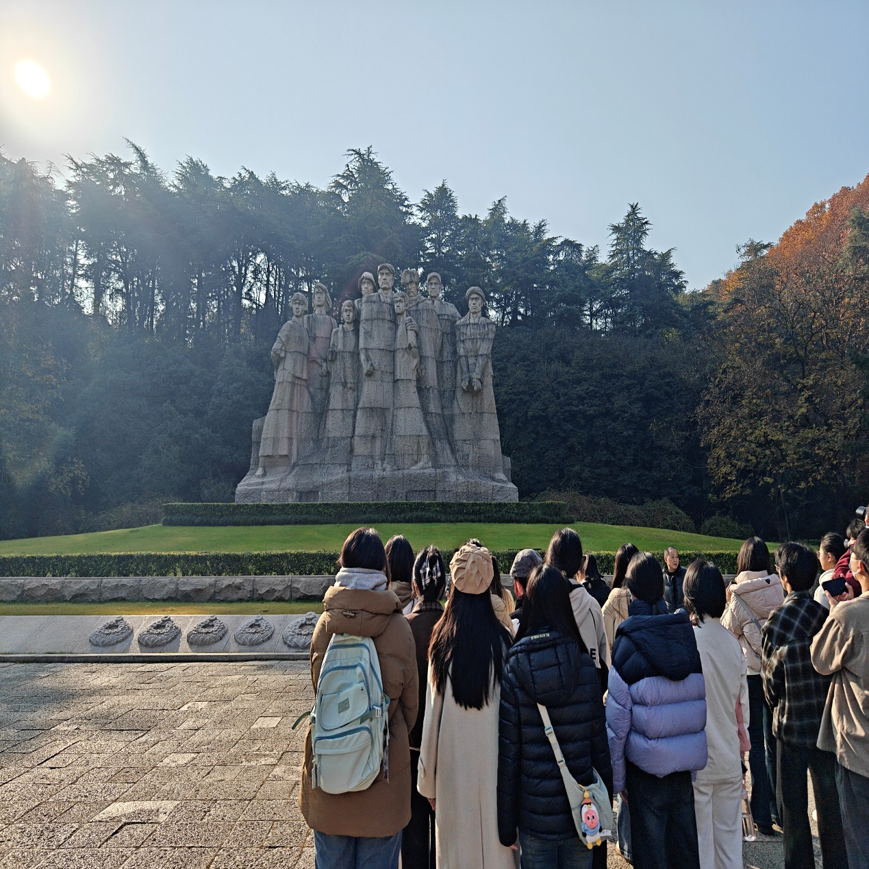 支部党员佩戴党员徽章,整齐列队于雨花台烈士纪念碑前。这座高42.3米的白色花岗岩纪念碑巍然矗立,碑身“雨花台烈士纪念碑”九个大字由邓小平同志亲笔题写,基座浮雕镌刻着“狱中斗争”“刑场就义”等场景,无声诉说着十万英烈用生命诠释的信仰之光。徐元龙老师带领全体党员鞠躬默哀,并缓步绕行纪念碑一周,深切缅怀革命先烈的丰功伟绩。