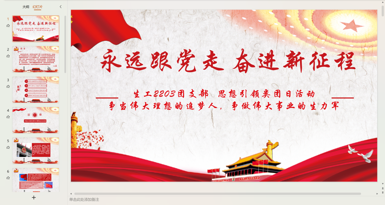 在党的二十大报告中,习近平总书记对青年提出了要求与期望,那就是“广大青年要坚定不移听党话、跟党走,怀抱梦想又脚踏实地,敢想敢为又善作善成,立志做有理想、敢担当、能吃苦、肯奋斗的新时代好青年。”为学习贯彻习近平总书记系列重要讲话精神,生工2203团支部以“青春告白祖国,扬帆展望未来”为主题,开展本次主题团日活动。希望通过本次活动的开展,让本支部的各位团员与青年切身体会作为新时代中国青年的使命与责任。深刻领悟生逢其时、重任在肩的道理,争当伟大理想的追梦人,争做伟大事业的生力军,同时始终牢记习近平总书记的殷殷嘱托,砥砺奋进、永久奋斗。生工2203团支部于2024年5月到2024年6月期间,进行了团日活动的开展。