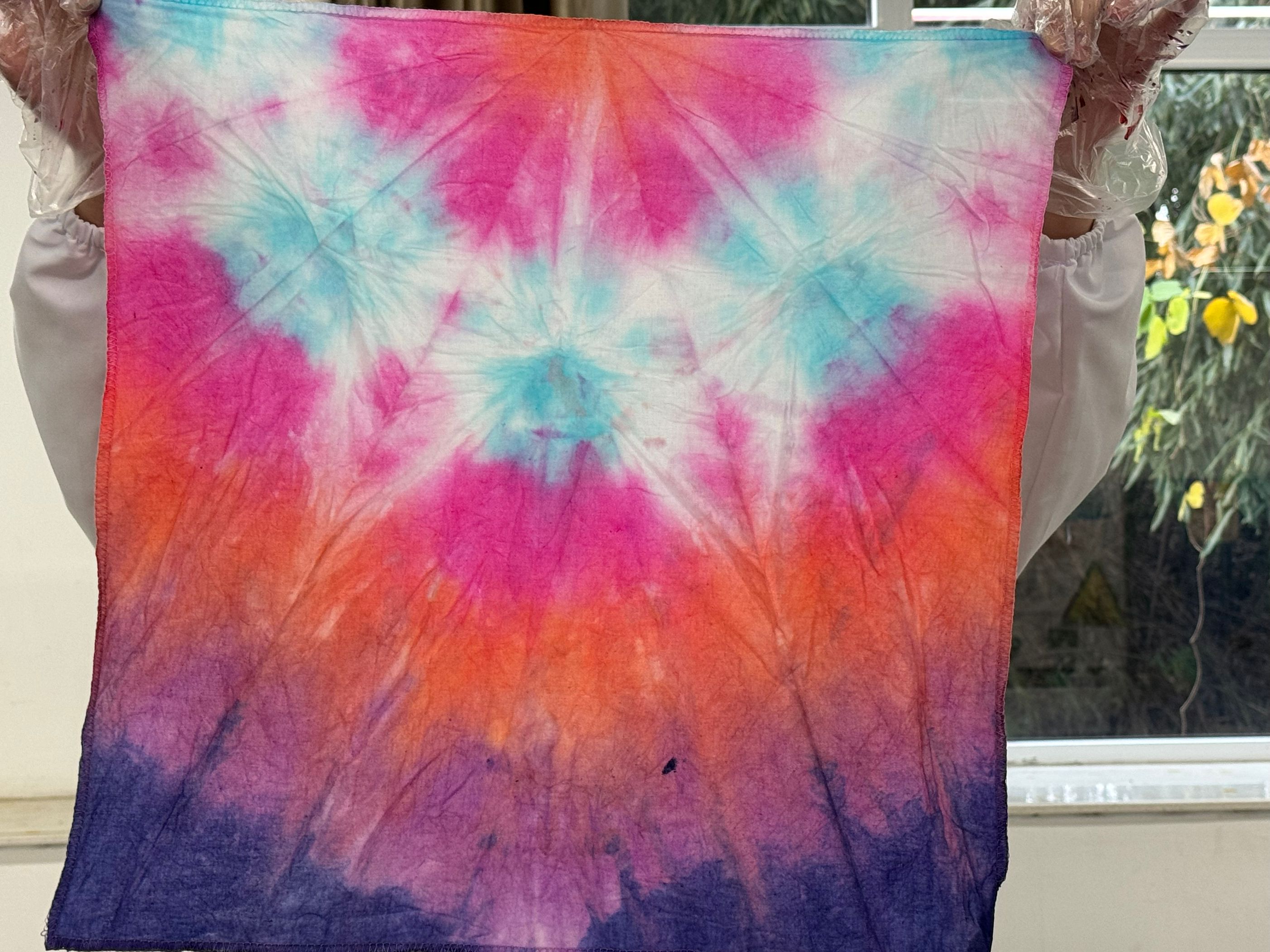 同学们在工作人员的指导下,使用方巾作为材料,通过折叠、捆扎、染色等步骤,亲手体验了扎染的全过程。每一块方巾在同学们的巧手下,逐渐展现出独特的色彩和图案,如同绽放的花朵,展现了扎染艺术的无限魅力。