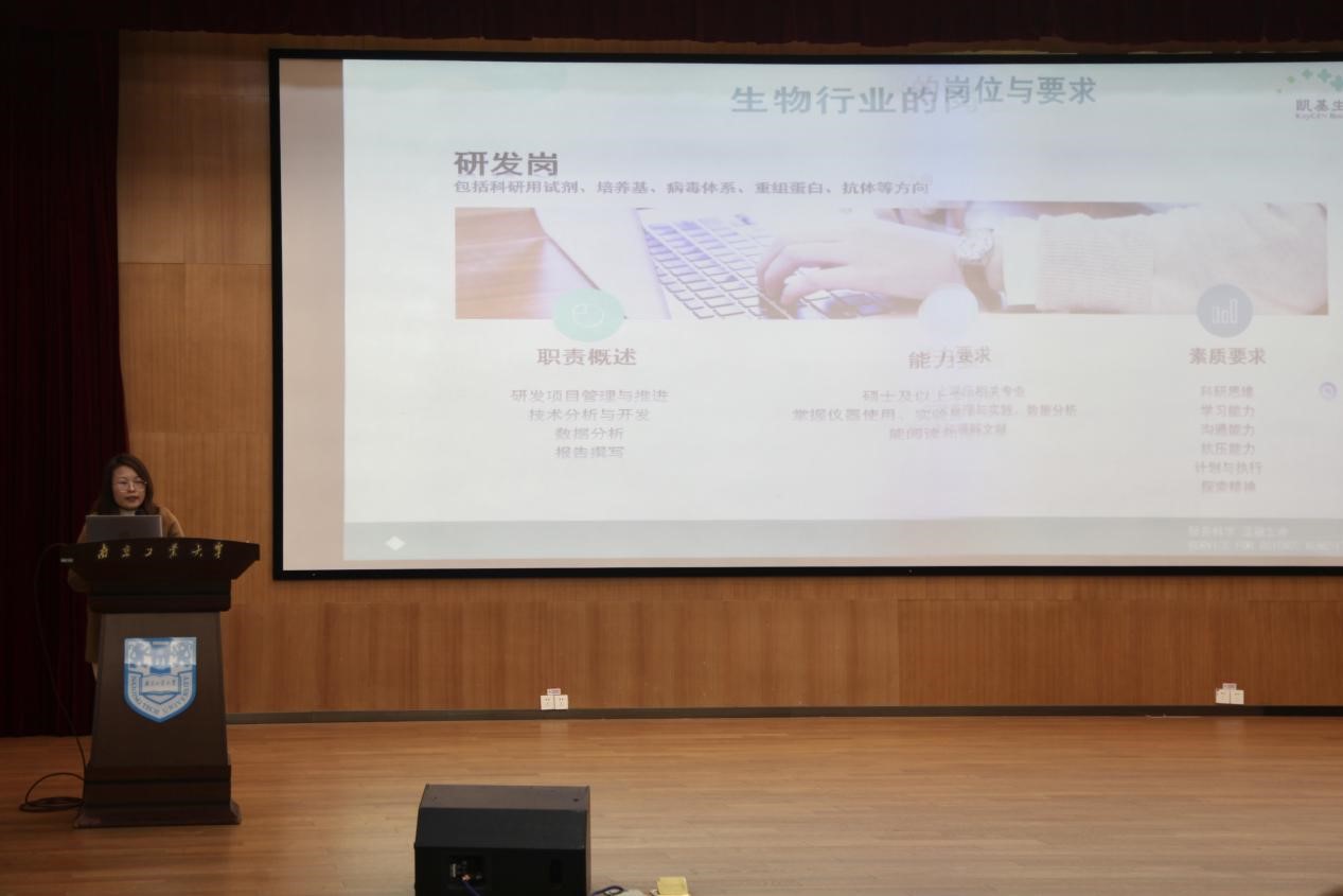 蒋经理开展了“书青春志,绘未来图”南工大新生职业规划报告会,她以凯基生物公司背景和文化为例,阐述了不同岗位的职责和技能要求,并深度解读了生物技术行业的前沿动态和对高素质人才的整体要求,对新生如何在大学期间发展提升给予了中肯的指导意见,为同学们提供了清晰的职业规划方向。同时,蒋经理还传授了面试应对和简历编写的技巧,鼓励同学们积极参加企业实习和实践活动,积累宝贵工作经验,为职业规划和高质量就业奠定坚实基础。