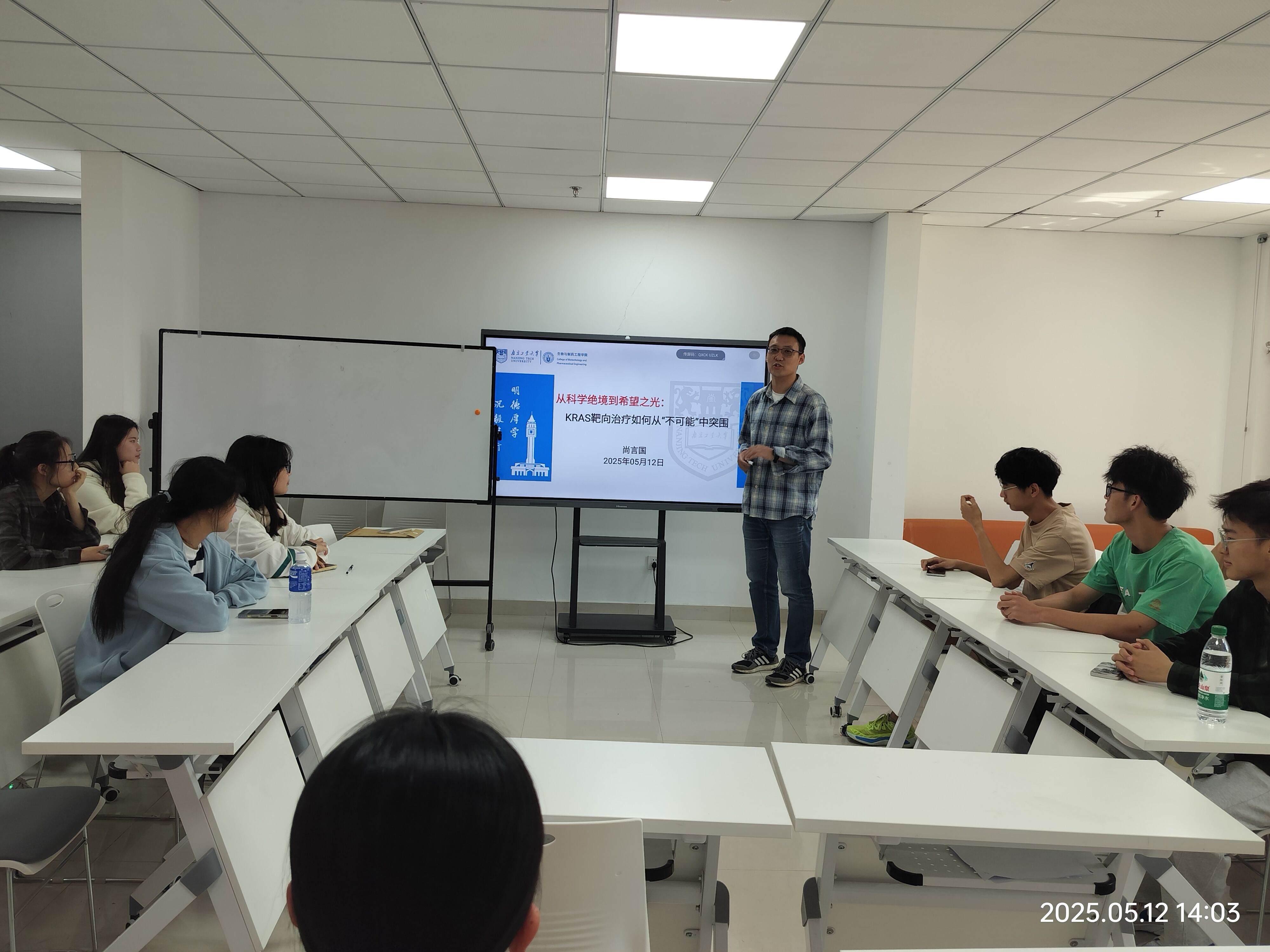 2025 年 5 月 12 日,一场主题为考研经验与老员工活分享的青椒讲堂在南苑一站式社区开展。讲堂伊始,制药2404班班主任尚言国老师为大家带来了 KRSA 靶向治疗的前沿介绍,让我们领略到在医学科研领域,如何从看似 “不可能” 的困境中寻找突破,为后续的考研经验分享奠定了充满挑战与机遇并存的基调。