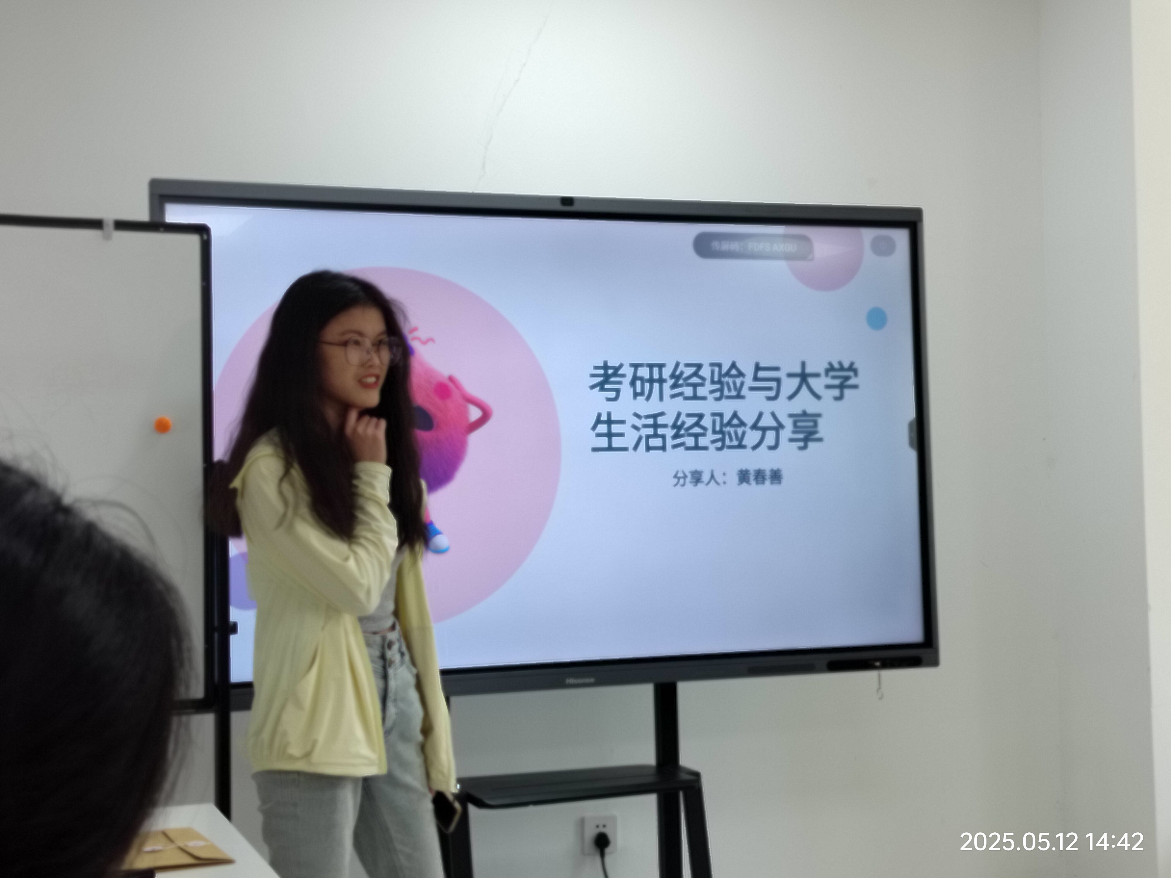 讲堂还邀请了林夏敬学姐和黄春善学姐就未来的学习生活进行了分享。林夏敬学姐首先谈到了考研的挑战与不确定性。她指出,考研之路布满荆棘,题目难度的波动、个人状态的起伏等诸多因素都可能左右最终的结果。在大三阶段,课程的繁重、员工会工作的繁忙与考研准备相互交织,时间管理成为了制胜的关键。她回忆起自己曾因压力过大几近崩溃的经历,动情地建议学弟学妹们在面对多重任务时要学会取舍,明确优先级,合理分配精力,才能在这场持久战中保持战斗力。