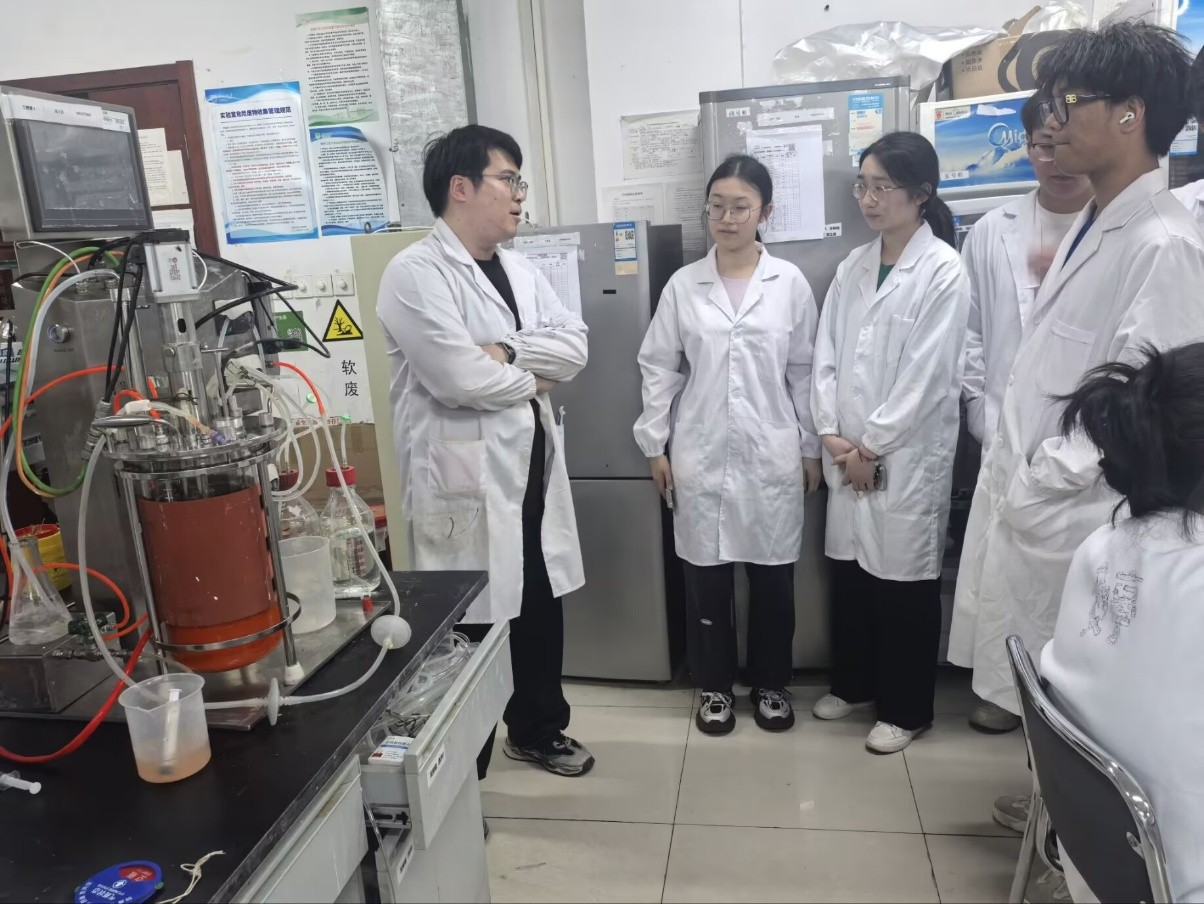 在博士生助教团队的指引下,同学们先后探访分子改造实验室和发酵实验室,为同学们介绍了相关仪器用法及其注意事项。随后在会议室中,姜老师现场演示了非粮生物质高效转化过程:秸秆原料经解聚、酶解等工序,最终转化为黄酮酸、通用型糖等高附加值产品。