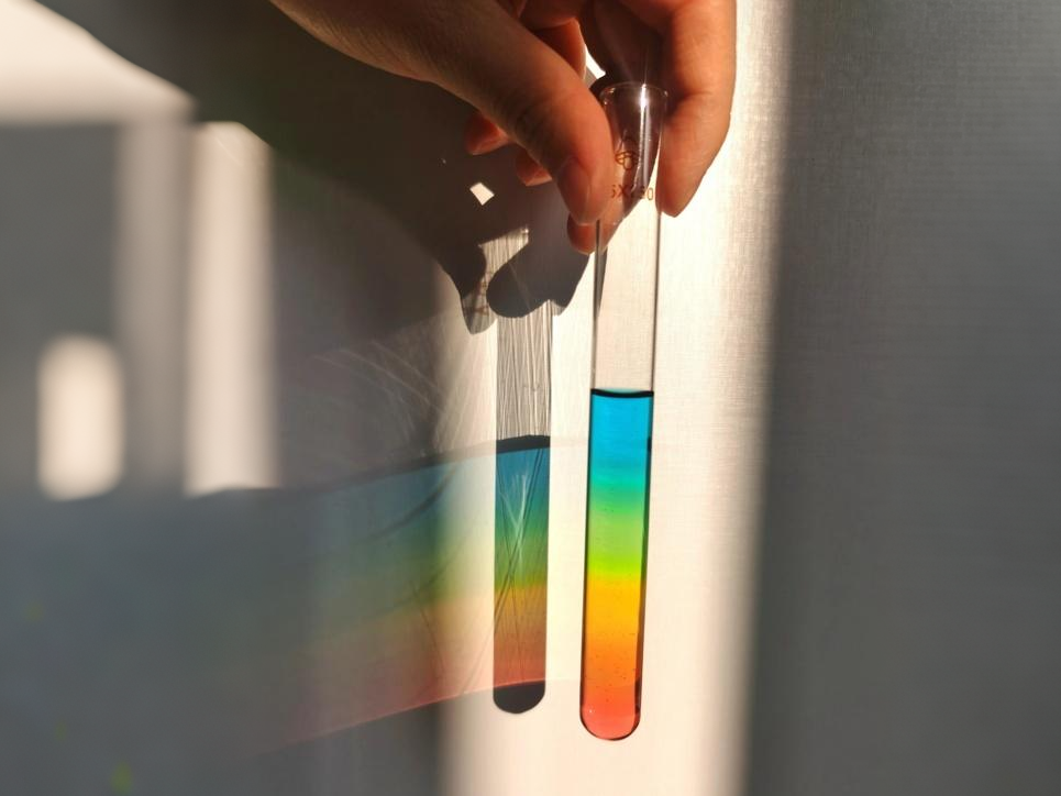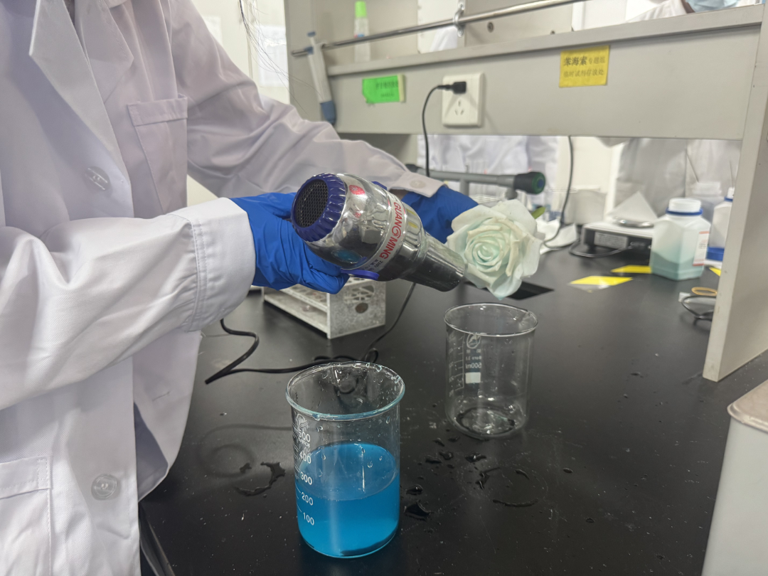 活动现场,生物化学工程国家级实验教学示范中心(best365官方网站)曾杨老师为同学们详细讲解了“固态彩虹”、“变色玫瑰”、“晶体花”和“流体瓶”制作的化学原理,并播放了规范的操作演示视频。在老师的指导下,同学们纷纷动手实践。他们小心翼翼地调配溶液,观察着溶液在不同条件下的奇妙变化。随着时间的推移,“固态彩虹”在试管内形成七色光带;“变色玫瑰”在酒精灯的灼烧下缓缓绽放;“晶体花”在容器中慢慢凝结,形态各异,晶莹剔透;色彩斑斓的“流体瓶”也在同学们的精心制作下完成,不同密度的液体在瓶中呈现出层次分明、绚丽多彩的景象。