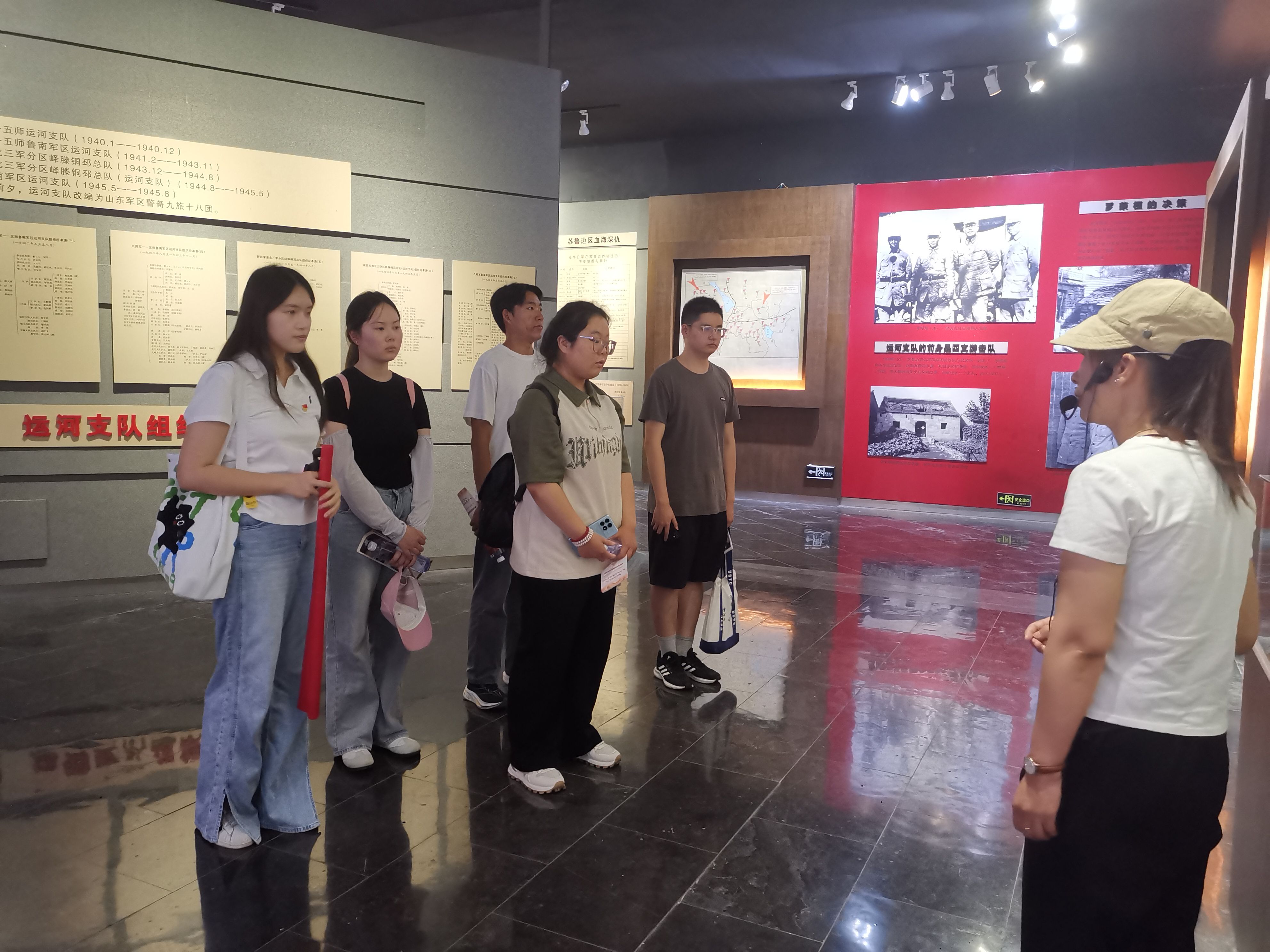 同学们首先来到徐州运河支队抗日纪念馆。1940至1945年间,运河支队以微山湖、黄邱山为战场,与日军展开生死较量,为抗战胜利铸就了铁血丰碑。步入展厅,军械、作战日记、烈士照片陈列眼前。同学们凝视烈士照片,胸腔骤然沉重。年轻面容定格在战火青春,令人肃然。支前民工的独轮车、缝军装的梭子常葆如新,它所代表的“兵民是胜利之本”的真谛,更是历久弥新。
