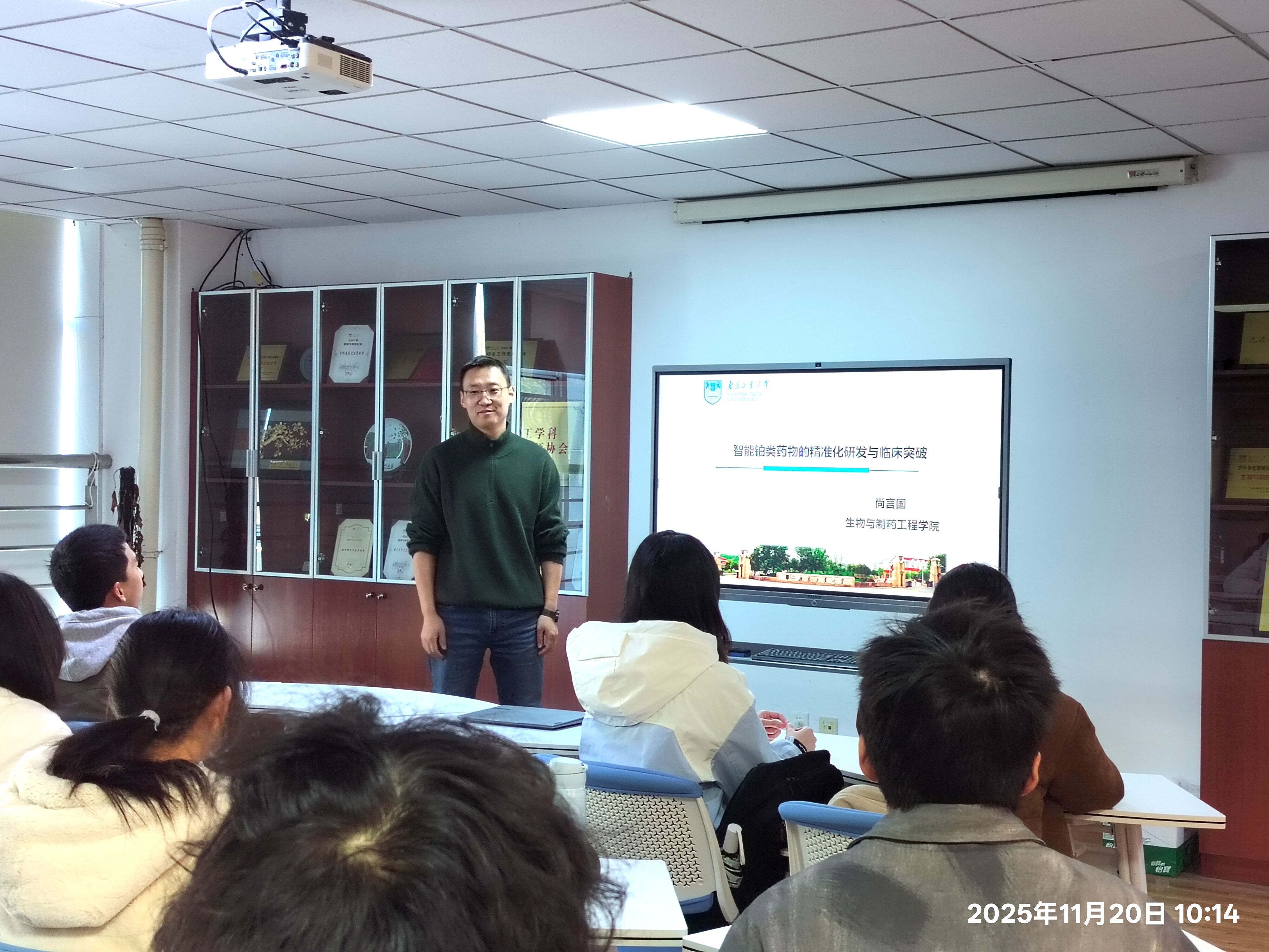 2025年11月20日上午,青椒讲堂举办专题讲座,尚言国老师面向制药2404班就抗肿瘤药物研究进展及员工学业发展等问题进行了系统讲解。本次讲座内容详实,既包含专业领域的前沿动态,也涉及员工培养的具体建议,为在场师生提供了一场富有启发性的学术交流。