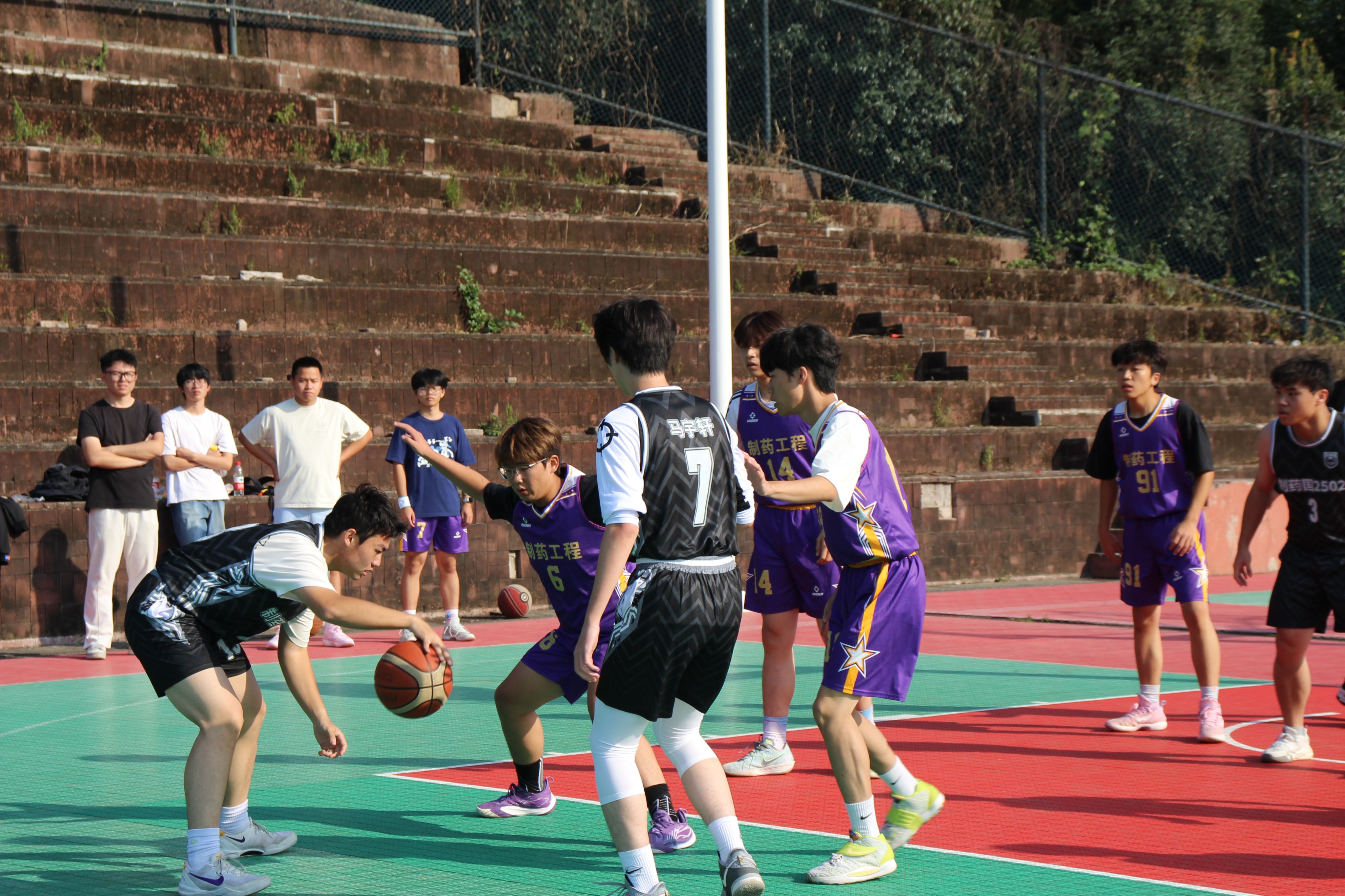 比赛伊始,双方迅速进入状态,攻防节奏明快,球员们默契配合、攻防转换间尽显战术智慧,一次次精彩抢断与绝杀进球引发现场观众阵阵欢呼。制药2502班率先打出优势,而制药国2502班则步步紧逼、寸土不让,始终以顽强拼抢将分差牢牢锁定在毫厘之间。每一次攻防都牵动着全场观众的心弦。