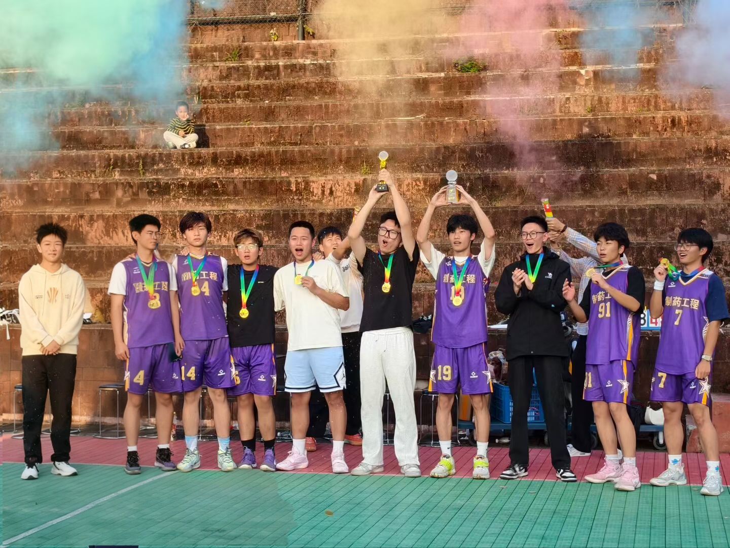 终于,终场哨声与观众的欢呼同步响起,制药2502班以一分之差险胜,在全场沸腾中捧起冠军奖杯。决赛落幕,荣耀时刻如期而至。院员工会主席团成员为本届逐梦杯篮球赛冠亚季军颁奖。