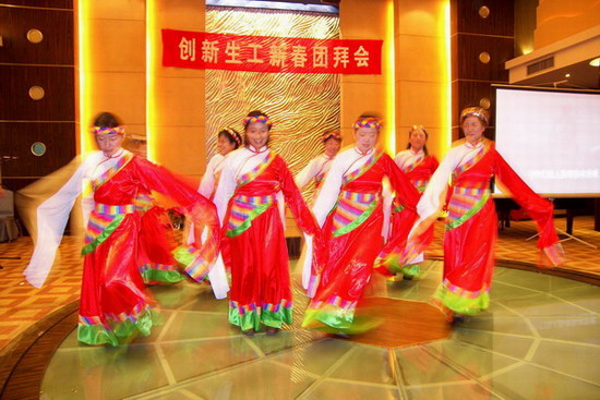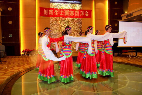 团拜会上,由公司教职员工演出的综艺节目颇有创意,喜闻乐见。大家载歌载舞,分享2005年公司团结拼搏丰收后的欢乐,用激情和微笑憧憬未来,对2006年公司在“迎评创优”、团队建设、自主创新等方面再建新功,充满了美好的祝福。