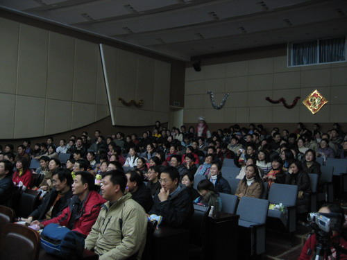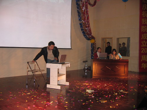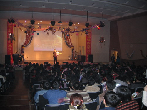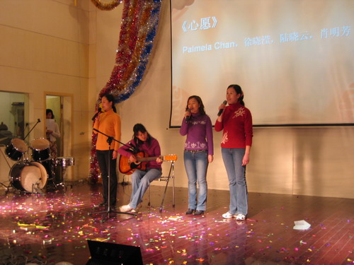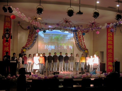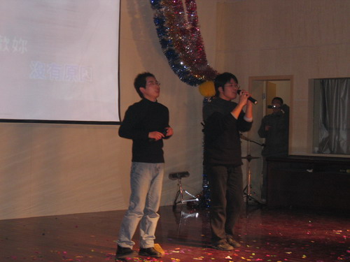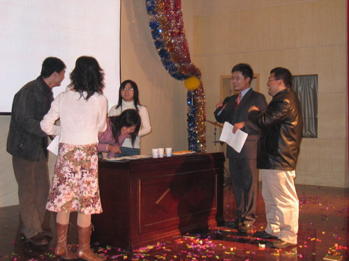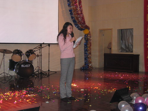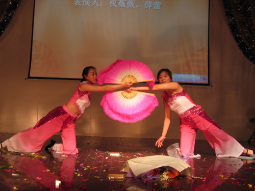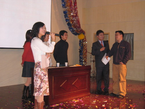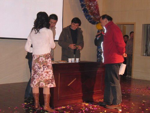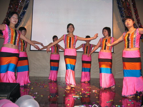 晚会节目精彩纷呈。歌曲、舞蹈、相声、小品一应俱全,乐器独奏、师生互动更是令人耳目一新。演出在小合唱《同一首歌》中拉开帷幕,05级研究生用他们的歌声表达了对公司的美好祝福;傣族《孔雀舞》舞蹈者技艺娴熟,动作柔和优美;双人舞《谁不说俺家乡好》舞姿婀娜,别有风味;唢呐独奏表演者指法灵巧,演技精湛,不断引来观众的掌声;王涛,张晓晓等同学倾力献上的小品《一网情深》以其诙谐的表演、幽默的台词不时引起同学们会心爽朗的笑声。外教Pamela Chan 和她的员工们的歌声博得了大家的一致好评。何学军老师的《万水千山总是情》,刘哓宁夫妇的《洪湖水浪打浪》给大家留下了深刻的印象。晚会穿插的师生互动游戏,更为晚会增加了一份欢跃的气氛,我们可爱的老师和员工玩在一起,乐在一起。晚会还安排了抽奖活动并设了丰厚的奖品,很多人在欣赏精彩节目的同时收获了一份意外的惊喜。晚会进行了两个多小时,最后在乐队青春奔放的演出中画上圆满的句号。