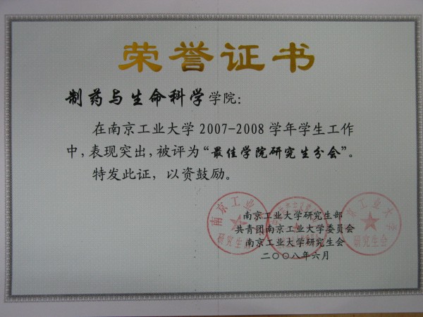 在刚刚结束的由研究生部,校团委举办的“2007-2008学年研究生会优秀部门及先进个人表彰大会”上,best365官网第五届研究生会获得“最佳公司研究生分会第一名”,研究生会成员周佳栋、周精卫、陈慧、肖亚东四名同学同时获得“best365官方网站研究生会先进个人”。