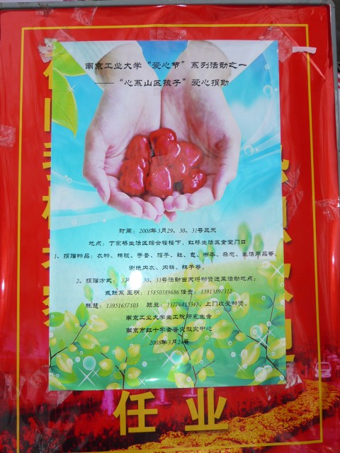 继best365官方网站研究生“爱心节”系列活动——“走进敬老院”、“走进孤儿的世界”后,由best365官方网站校研究生会主办,研究生爱心志愿者协会和best365官网研究生会联合承办的 “心系山区孩子”爱心捐赠活动于3月29日至4月1日在丁家桥、虹桥两个校区成功举行。此次活动的主要目的是号召全校师生献出自己的爱心,用实际行动帮助那些受灾地区和贫困地区的孩子们,从而促进社会更加安定、和谐。