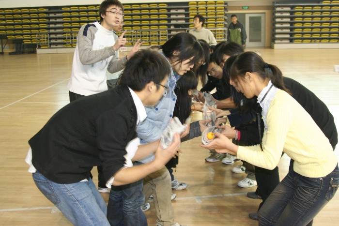 现在就具体分析一下六个活动吧。作为核弹头队队长,我选择A4穿越作为第一个项目,因为相对来说它的难度最低,关键是安排好穿洞的先后顺序,让在第二个诺亚方舟环节中,方布四角的队员先过,然后是站在布中心的女生,这样就很自然地把前两个游戏衔接了起来。第三个选择做的项目是兄弟连,因为起初安排的时候就有针对性地把完成它的队员和做移动小球的人员分开,所以在一部分人进行第三个项目的同时,其余的人可以去准备下一个移动小球项目。在接下来的衔接中把这个理念也运用的淋漓尽致。