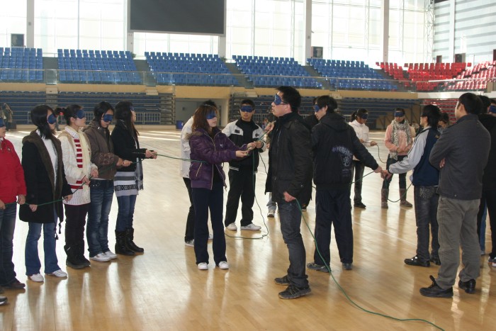 盲人方阵的游戏规则是以团队为单位,全体队员必须戴上眼罩,于失去方向感的情况下,在三十分钟内找出教练分散放在不同地方的五根绳子,并用它组成最大的正方形。在戴上眼罩的那一刻,颇有世界末日的感觉,看不到队友,不知自己身在何处,耳边乱糟糟的,还有莫名的恐惧。在短暂的慌乱之后,一个队员大喊“大家都不要讲话,牵着身边队员的手,不要让自己的手空着,这样我们就能组成一个圆了。”当手触到队友温暖的手时,内心的恐惧瞬间融化,不再孤单,感觉到不再是一个人去摸索,身边有队友的存在,团队的支持真好。我们很快组成了一个大圈,本来打算以此为网,从边界向前一路扫荡,尽快找出绳子。岂料犯了一个最低级的错误,我们是一个圆,每个人都向前走自然只是围着圈原地打转,浪费了好长时间,还好慢慢地圆圈变了形才得以前进。折腾了好久我们才找齐五根绳子,下一个难题是如何围成一个相对标准的正方形。三十多人的盲人团队,完全靠声音和感觉传递信息,我们尝试了好多建议,最后采取先对折成一条直线,然后四个顶点外扩的策略,由郝思清同学专门负责丈量找点。最终顺利完成。