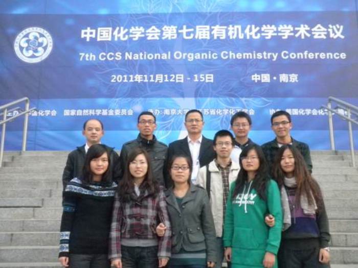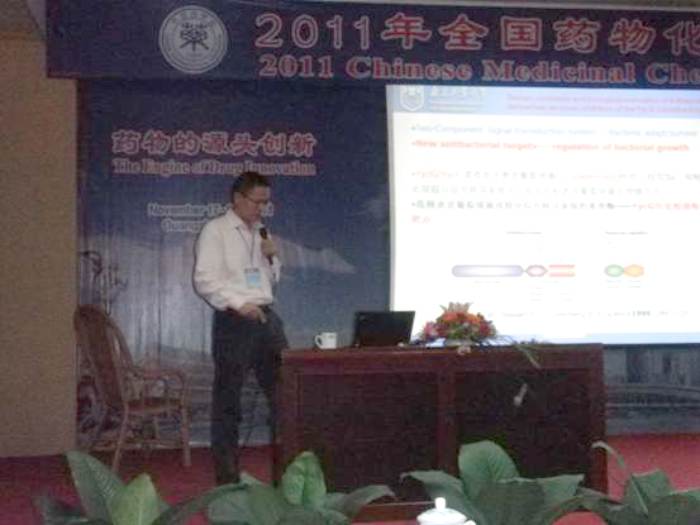 随后,韩世清教授携研究生郑礼康赴广州出席了“2011年全国药物化学学术会议暨第三届中英药物化学学术会议”, 韩世清教授受邀在会上做了题为“Design, Synthesis and Biological Evaluation of 4-Thiazolidione Derivatives as Novel Inhibitors of the YycG Histidine Kinase” 有关药物分子创新的口头报告。全国药物化学学术会议由中国药学会药物化学专业委员会主办,会议两年一次,是药物化学的学术盛会,是我国的药物化学研究者良好的交流平台,今年的会议主题是药物的源头创新。