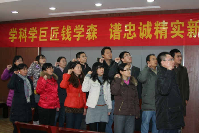 12位新入职的教师站在“学科学巨匠钱学森,谱忠诚精实新篇章”的会标下,在校优秀共产党员、教书育人先进个人、“工大九思精英奖”获得者、博士生导师李振江教授的带领下,面向鲜红的国旗庄严宣誓:“我立志做一名人民教师。努力做到:育人为本,敬业爱生;明德厚学,启智求真;沉毅笃行,创新创优;爱国荣校,奋斗终身”!