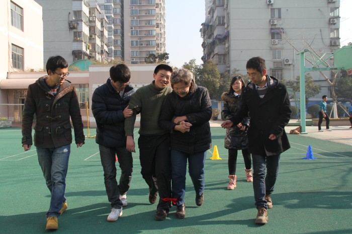 欣赏完节目之后,家长与同学们共同参加体育活动,分别在四个场地举行“绑腿跑比赛”、“持球投篮”、“踢球入门”,以及“滚球赶猪”等活动。志愿者们分别在四个场地协助同学及家长们进行活动,与特校员工及其家长一起分享了比赛的乐趣。