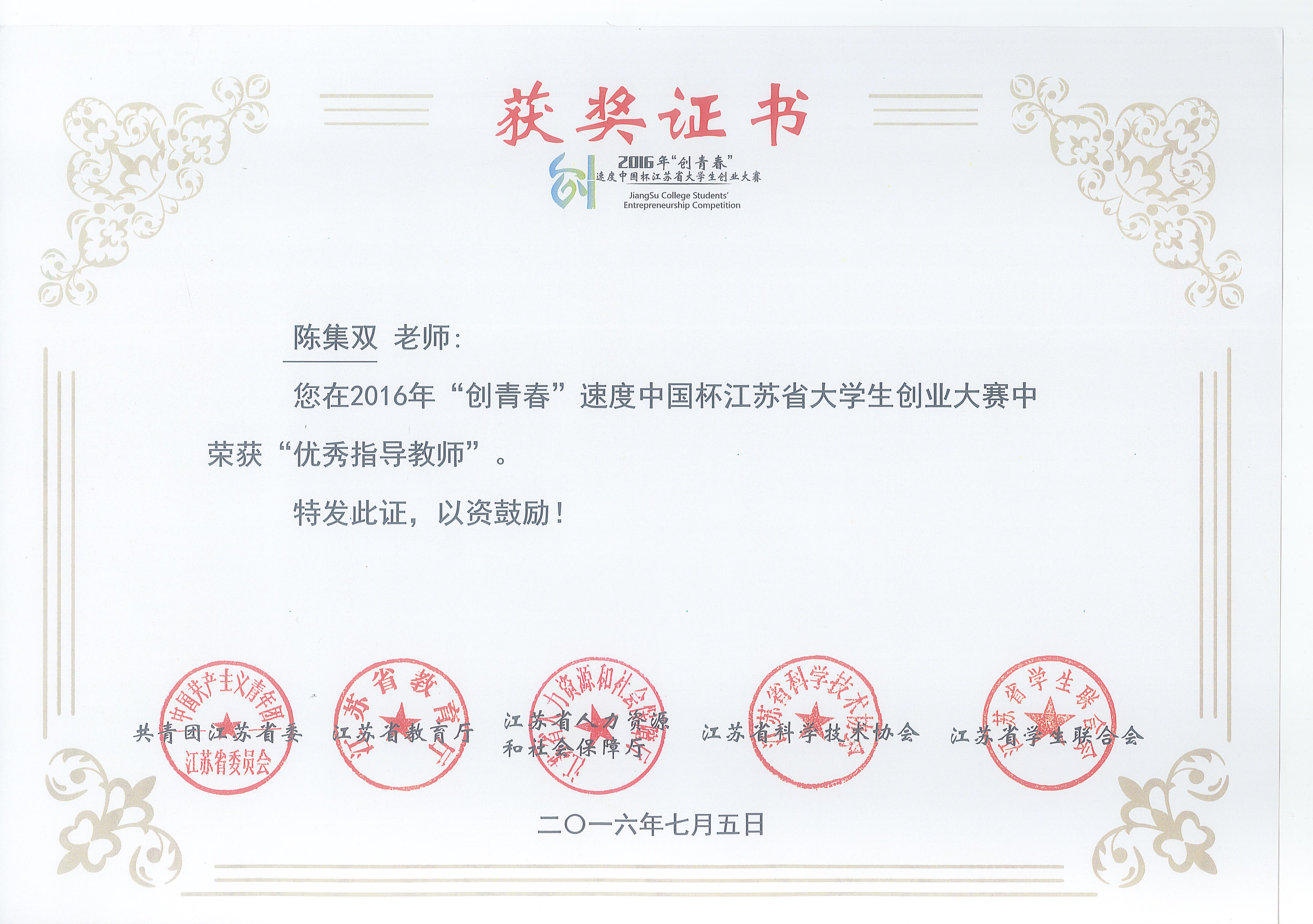 近日,2016年“创青春”江苏省老员工创业大赛比赛成绩公布确认,best365官网选送的作品《南京维思创新材料科技有限公司》喜获大赛金奖;指导老师陈集双教授获“优秀指导教师”。