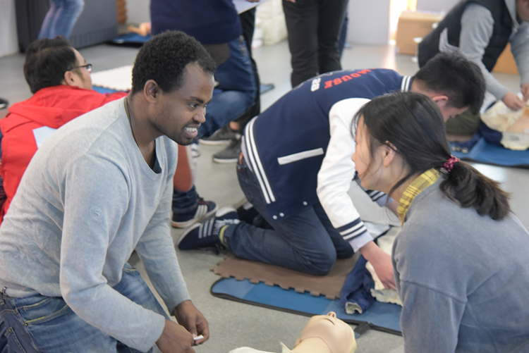硕士、博士生在应急救护实训中显示了较好的知识能力、较强的动手能力和主动实践能力,能更好的的完成学习和操作任务。博士职工Haile是第一次参加急救培训,表示要进一步参与训练和服务,回国后继续为红十字义务工作。