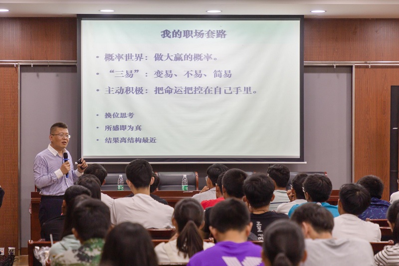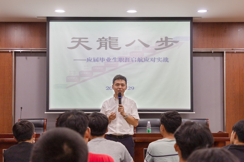 纪海旺总监以“天龙八步——应届毕业生职涯启航应对实战”为主题,从自己的工作经验出发,为同学们分步讲解了求职过程的八个步骤以及各个环节的应对策略,并分享了自己对于职业的理解。纪总监向同学们讲述了自己的就业经验和工作心得,告诉同学们要尽早认知、分析并找到自己的就业方向,鼓励大家主动出击、积极应对工作面试,在职场扬帆起航。纪总监生动幽默的分享赢得了在场听众的阵阵掌声。