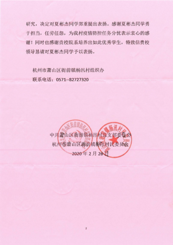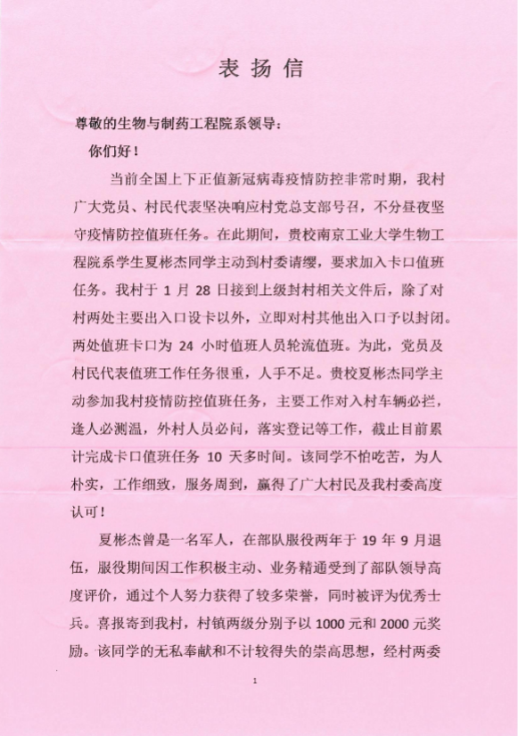 近日,生工公司党委收到杭州市萧山区衙前镇杨汛村村两委寄来的表扬信,感谢公司生物工程专业生工类1902班夏彬杰同学为该村疫情防控工作做出的贡献。