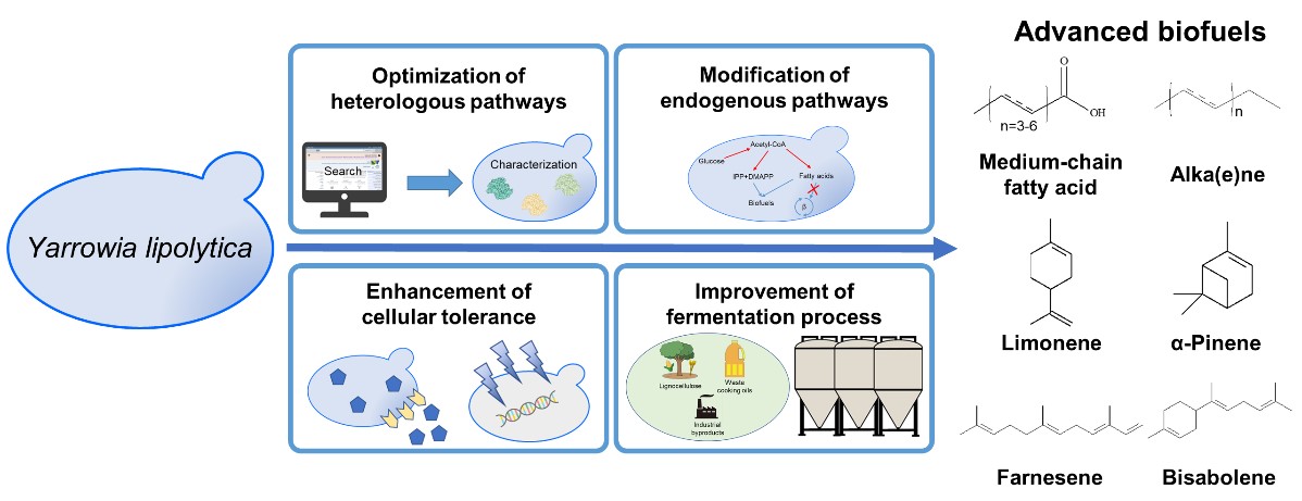 如今,能源短缺与全球气候变化带来的影响日益严峻,而生物燃料技术的开发有利于缓解这两大问题。生物乙醇和生物柴油主导了目前的生物燃料市场,然而这两种燃料化学品存在能量密度低,与现有设施不兼容等问题,不能很好替代化石燃料。相比之下,脂肪酸与萜烯衍生的先进生物燃料分子具有与化石燃料相似的特性,与现有的存储与交通设施高度兼容,被誉为高级生物燃料(Advanced Biofuels)。例如,脂肪酸衍生的烷烯烃的能量密度高于生物柴油,而萜烯类化合物柠檬烯的能量密度与航空燃油相当,且低温下的流动性优于航空燃油。解脂耶氏酵母被广泛认为是生产脂肪酸和萜烯衍生化学品的卓越工业宿主。在过去几年里,多样的合成生物技术手段已被用于发掘解脂耶氏酵母的生产各种高级生物燃料生产的潜力。基于此,文章总结了通过合成生物技术提高解脂耶氏酵母高级生物燃料生产能力的策略,并展望了未来构建解脂耶氏酵母细胞工厂生产高级生物燃料的前景。