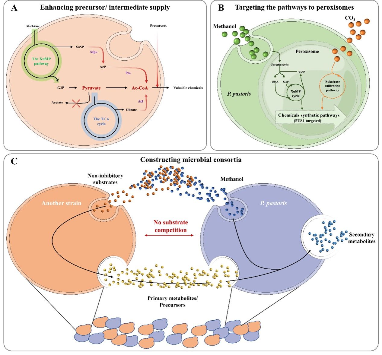 图2.在毕赤酵母中增强化学品生产的策略。(A)加强前体/中间体供应;(B)过氧化物酶体区室化工程;(C)构建人工多细胞体系。