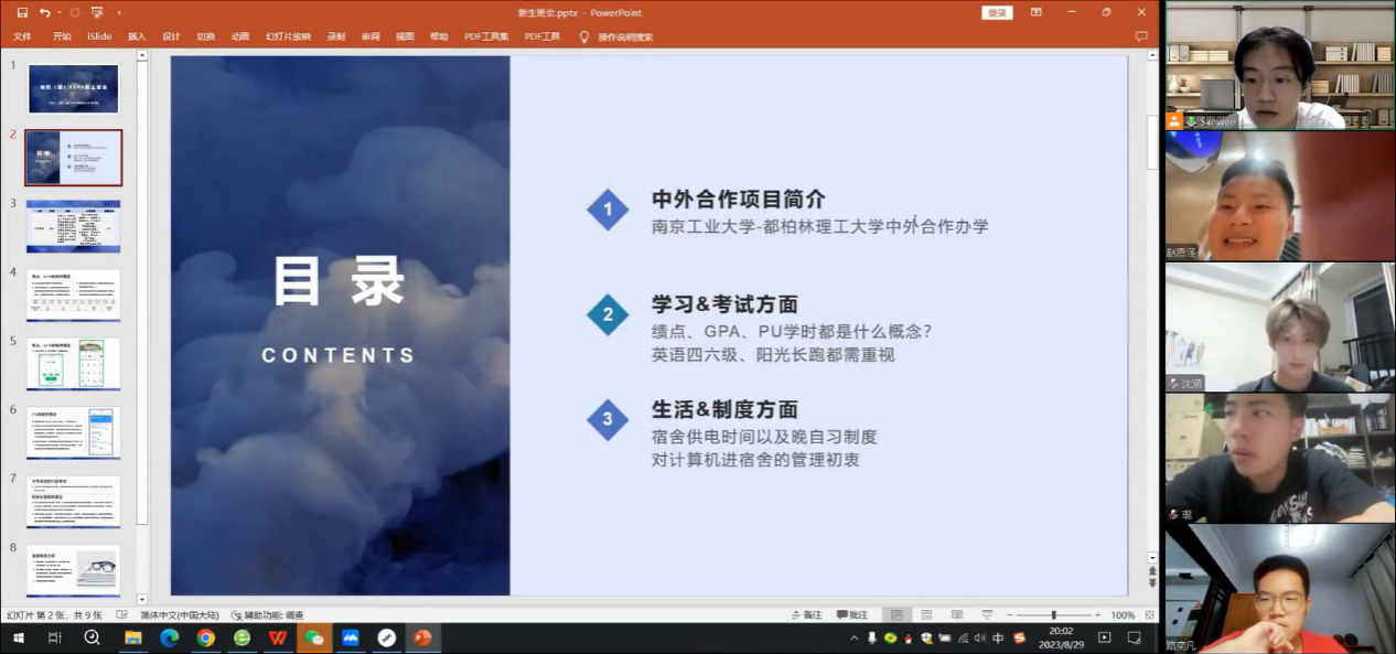 各本科生班级助理班主任向新生详细介绍大学学习与高中学习的本质区别,答疑关于学位、学分、专业培养方案、选课等学业相关制度文件,帮助新生全面了解大学学业要求,制药(国)专业结合本专业特色,对中外合作项目进行介绍和答疑。为提高学习效率,强化学习技能,助理班主任还为新生整理并介绍常用的学业查询等应用软件,帮助新生实现从“要我学”到“我要学”的转变,培养自主学习意识。生活方面,助理班主任针对校园环境、宿舍生活、服务设施等进行详细入微的介绍,给予即将面临自主生活的新生充分的安全感和信心。为保护好新生的钱袋子,班会专门设置共同观看防诈骗宣传视频板块,并邀请新生家长一同观看,切实筑牢反诈防骗墙。