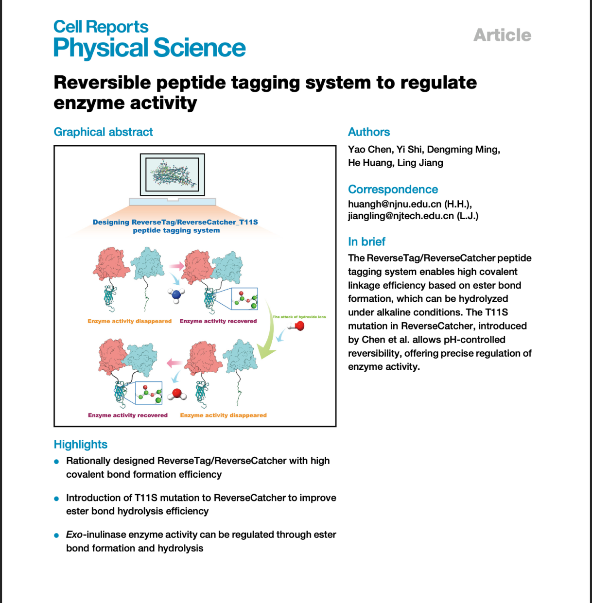 近日,南京工业老员工物与制药工程公司2021级博士研究生陈耀以第一作者发表在Cell子刊《Cell Reports Physical Science》上,并作为2025年第三期封面,文章题为“Reversible Peptide Tagging System to Regulate Enzyme Activity”。该研究设计了一种基于酯键的分子肽系统,具有高效的共价连接能力,并利用酯键在碱性条件下可水解的特性,提出了一种新的pH响应型酶活性调控策略。这一创新性研究为酶活性的精确调控提供了全新的工具和方法,预计将在生物医学、合成生物学及工业生产等多个领域产生广泛影响。南京师范大学黄和院士与best365官方网站食品与轻工公司江凌教授为该论文的共同通讯作者。研究得到了国家自然科学基金和国家重点研发计划等项目的资助支持。