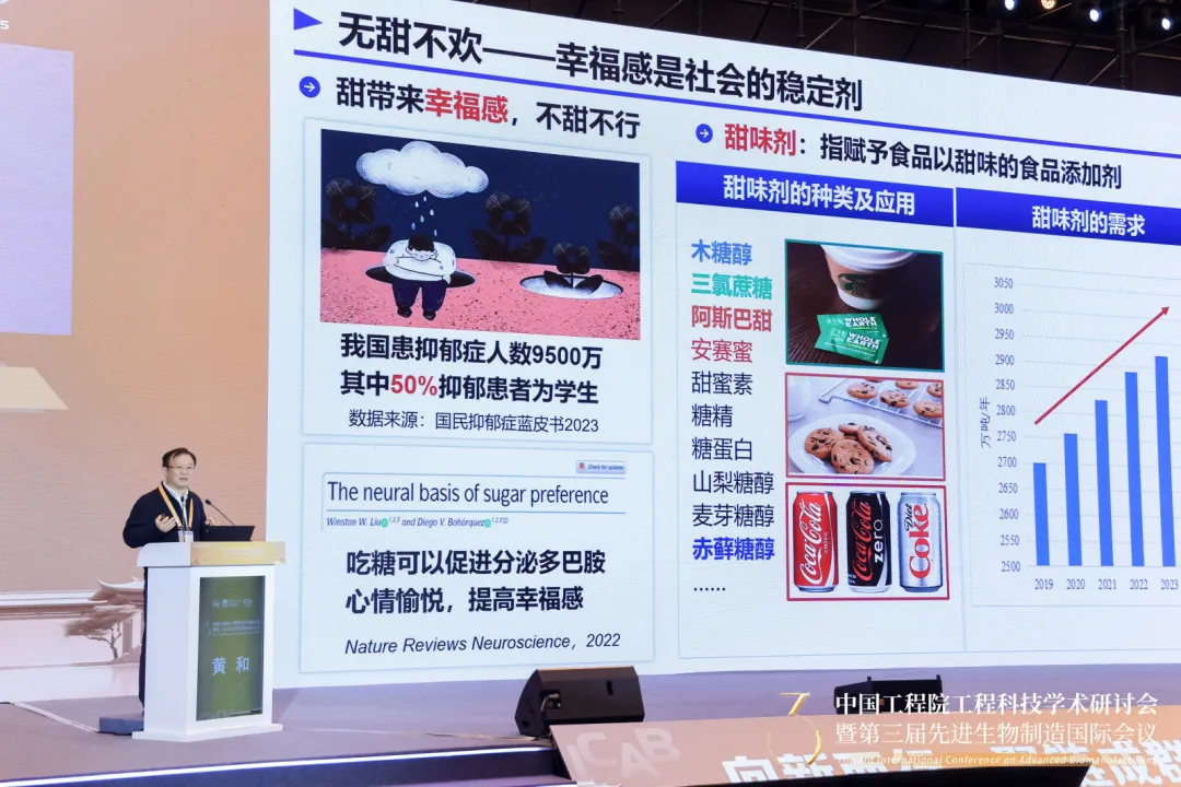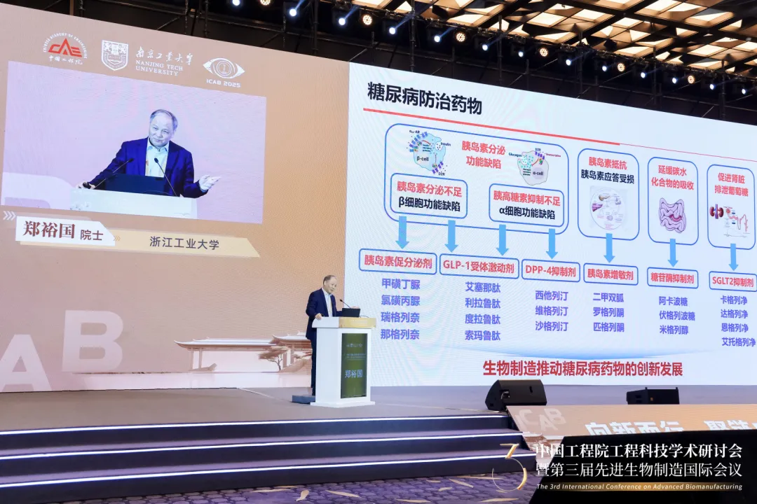 中国工程院院士、浙江工业大学郑裕国教授作《合成生物制造驱动糖尿病及其并发症防治药物和药械的创新发展》大会报告
