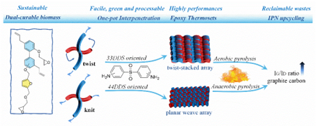 结合生物基环氧树脂的功能化开发已有研究基础,best365官网K&k团队基于朴酚类化合物与5-羟甲基糠醛自主开发了新型生物基环氧单体结构,首次通过一锅法构建互穿聚合网络体系,并借助于聚合工艺优化实现互穿网络结构的调控,从而得到具有扭曲叠加和平面编织的微观结构。通过上述策略构建的环氧树脂材料,其储能模量可以高达5.04 GPa, 且工作温度范围可提高到230℃左右;该结构同时也赋予了材料较好的介电性能、抗形变性能以及阻燃性能等等。此外,针对新型结构进行碳化实验,选择性控制实现生物质碳资源的向生物质石墨烯结构的转化。相对于传统的石油基和已报到的生物基环氧树脂材料,该工作均显示出很好的技术优势。